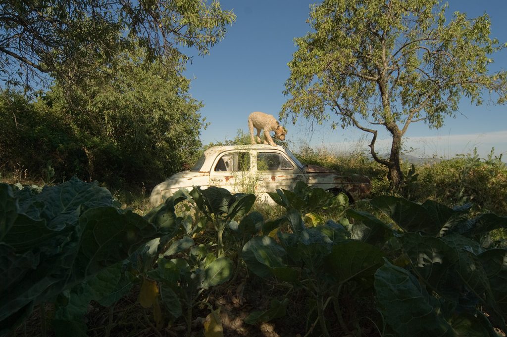 En ese mismo nivel de transgresión están los coches abandonados en el campo: la sombra del land art es alargada. En estos coches pasaron muchas cosas: lunas rotas, bacas flacas, gatos oxidados, coitos épicos, algún óbito. Y como los toros devueltos a chiqueros, esperan pacientes una segunda oportunidad para que la vida les dé todo lo que merecen. Desde allí modifican el entorno y explican la ruralidad, esa que tiene a la tecnología como sierva y no como dueña.