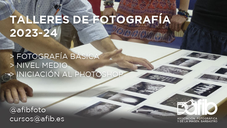 Programa de Talleres que organiza AFIB para 2023-24: Fotografía básica, una buena ocasión para aprender a conocer tu cámara y otras cosas que debes saber antes de salir a hacer fotografías. A continuación otro taller con una Introducción al Photoshop a cargo de Pilara Vicién...